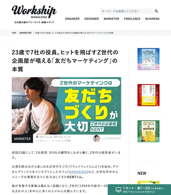 弊社(株式会社GIG)が運営する、フリーランス・副業メディアWorkship MAGAZINEに掲載されている取材記事の事例を紹介します。