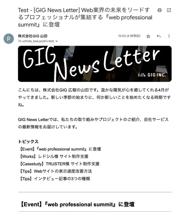 弊社(株式会社GIG)が配信しているメールマガジンの実例です。