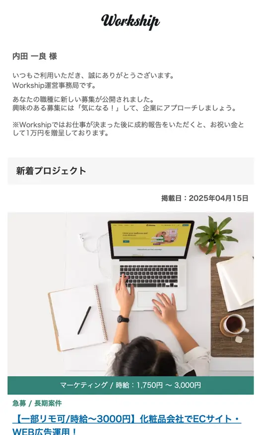 また、GIGが提供しているフリーランス・副業向けプラットフォームWorkshipでは、職種別に新規案件を通知する、パーソナライズドされたメールを配信しています。ユーザー別に有益な情報を提供できる点が、メールマガジンの強みと言えるでしょう。