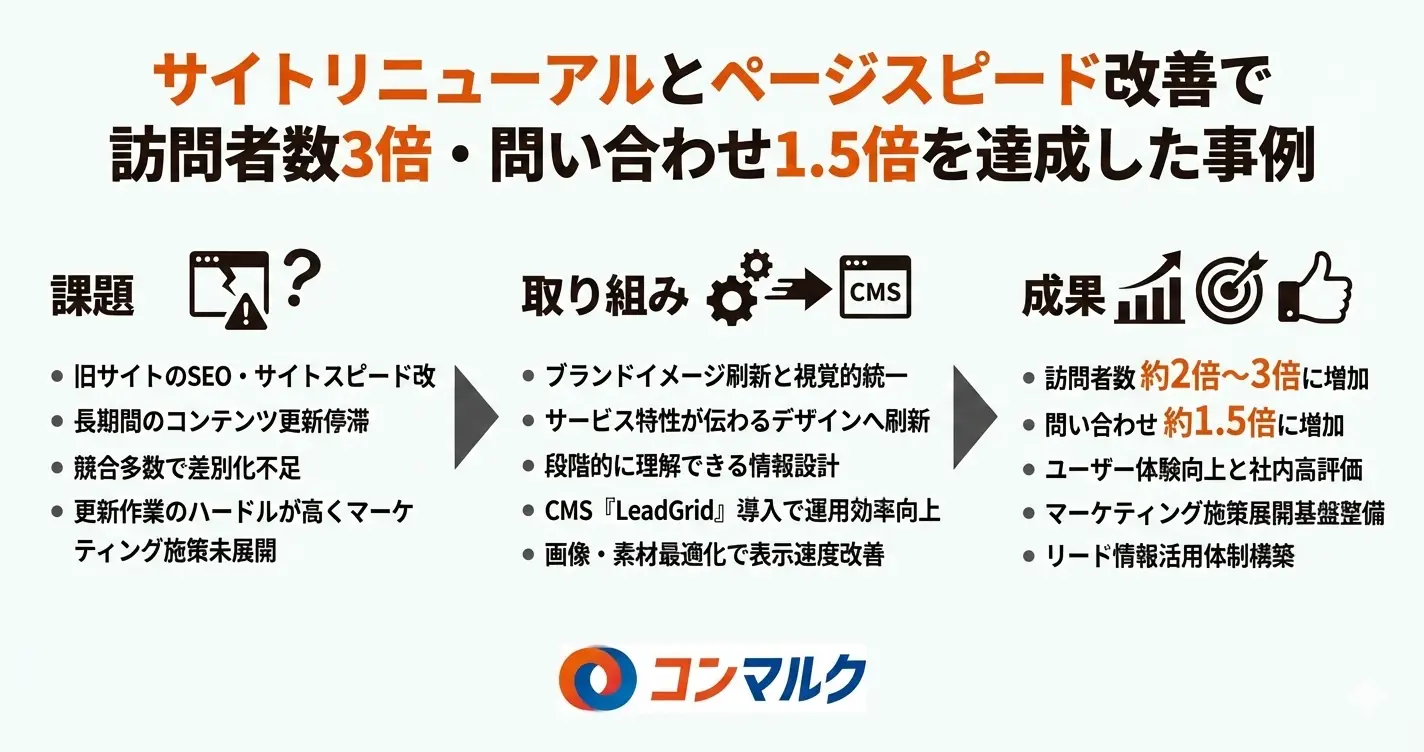 サイトリニューアルとページスピード改善で訪問者数3倍・問い合わせ1.5倍を達成した事例