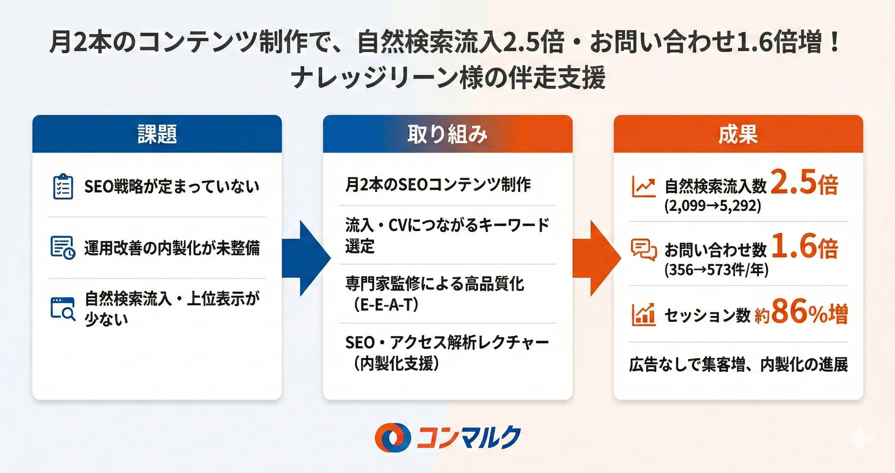 今回はナレッジリーン様の伴走実績を紹介しました。月2本のコンテンツ制作だけで、セッション数86.4%増、お問い合わせ数60.9%増を達成。