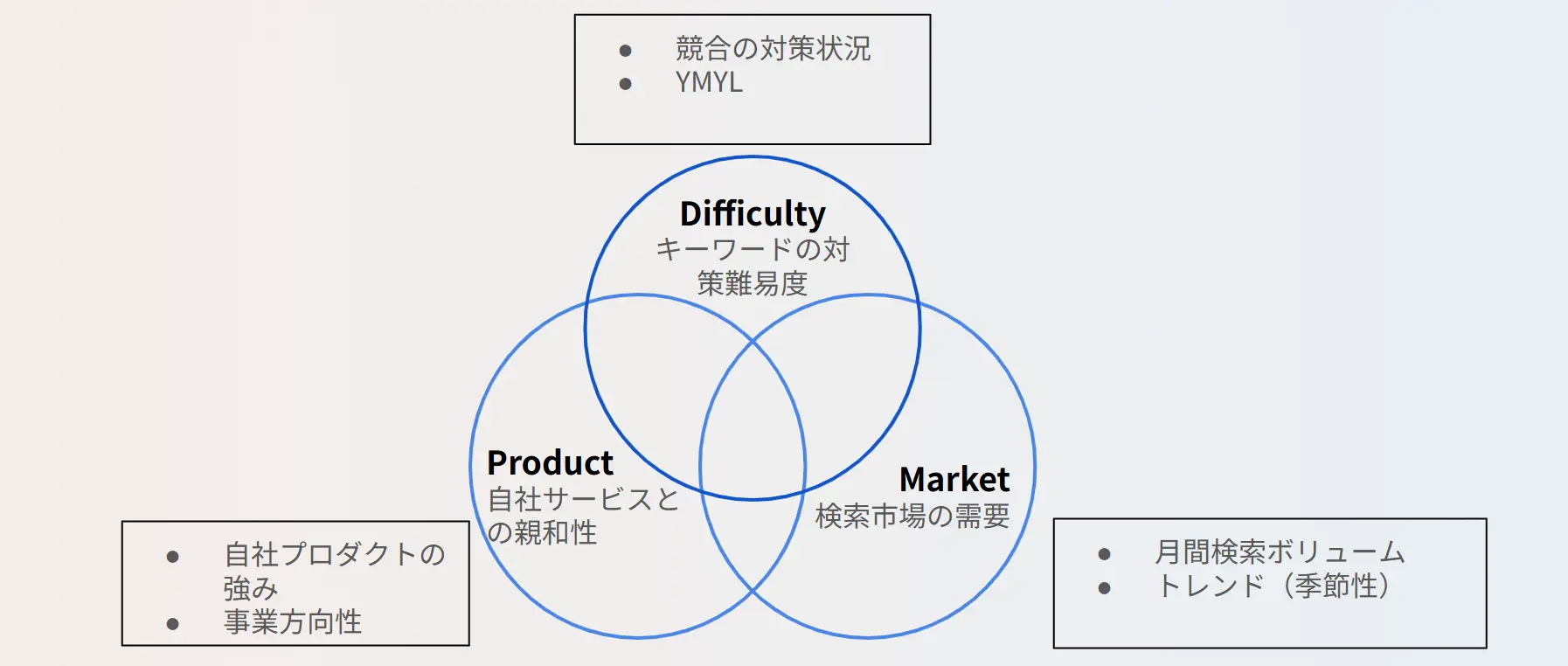SEOキーワードを選定するうえで、キーワードの対策難易度、自社サービスとの親和性、検索市場の需要の3要素での検討は欠かせません。