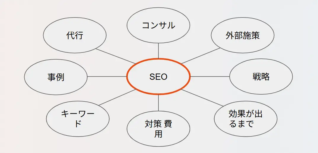 | 子キーワード | 親キーワードの内容をより細かく切り分けたキーワード | SEO コンサル SEO 外部施策 SEO 戦略 SEO 効果が出るまで SEO 対策 費用 SEO キーワード SEO 事例 SEO 代行 |
