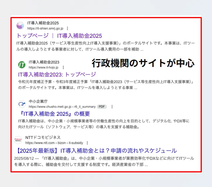 さらに「IT 補助金」の例では、検索上位は行政機関のWebサイトで埋め尽くされています。行政機関のWebサイトはE-E-A-T(経験・専門性・権威性・信頼性)が非常に高いため、民間事業者がコラム記事で上位表示を目指すのは難しいでしょう。