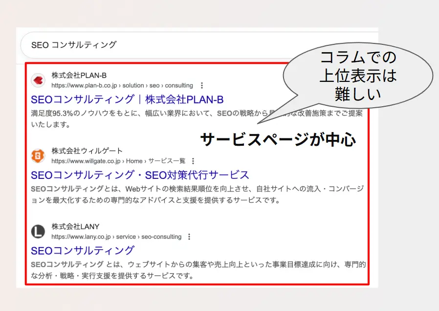 たとえば「SEO コンサルティング」の検索結果を見てみると、上位記事はサービスページが中心となっています。この場合、コラム記事が上位表示される難易度は高いと推測できるでしょう。