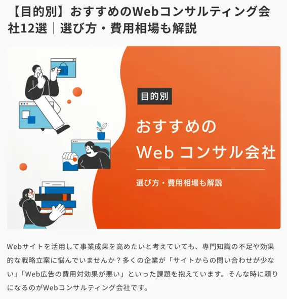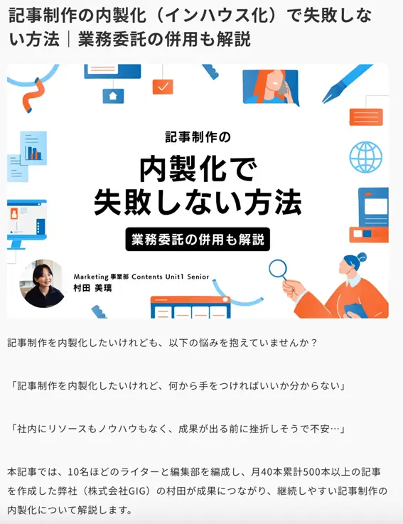 弊社(株式会社GIG)では、「コンテンツマーケティング 会社」や「Webコンサル 会社」など複数社を比較する記事を作成し、自然な形での相互リンクを実施しています。