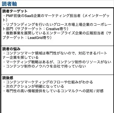 | ターゲットとペインの関連性 | 自社サービスのターゲットと近しい検索意図になっているか |