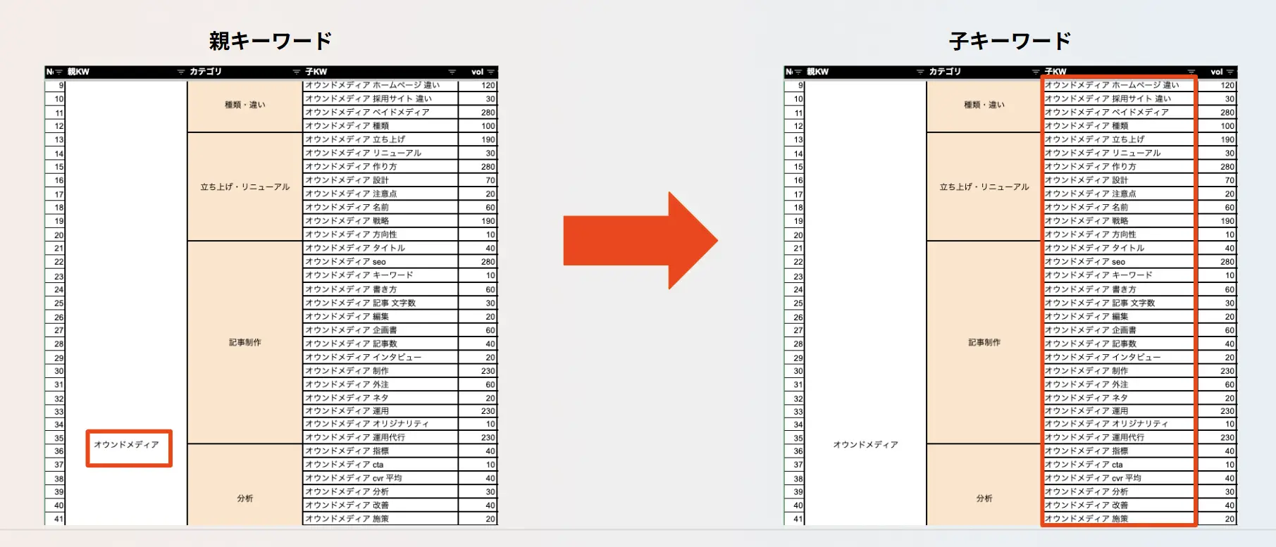 親キーワードとしては「オウンドメディア」「SEO」など、大枠のテーマとなる言葉を選びましょう。親キーワードを選定した後、「オウンドメディア 立ち上げ」「オウンドメディア リニューアル」など、検索意図をより絞り込んだ子キーワードを選定します。