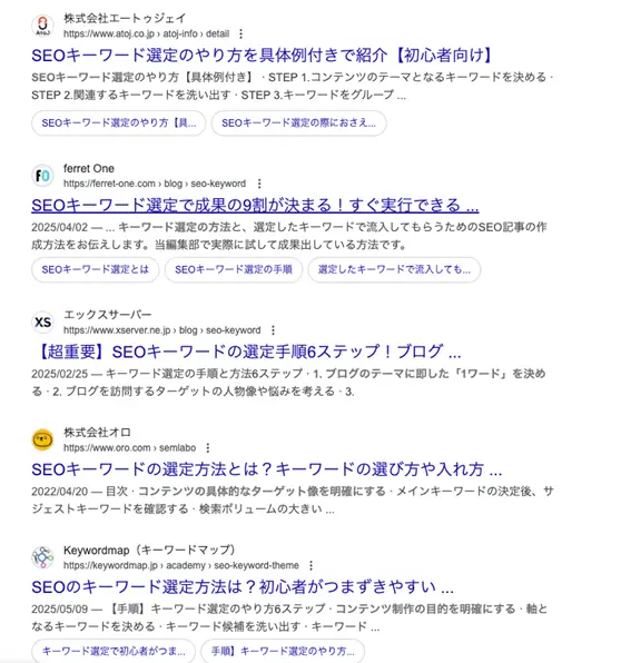 たとえば「SEO キーワード選定」の検索結果から上位記事の内容を見ると、SEOキーワード選定のやり方や手順に関する記事が多くあります。同キーワードについて自社で対策する場合も、SEOキーワード選定の具体的な方法を盛り込んだ記事にすれば良いことが分かります。