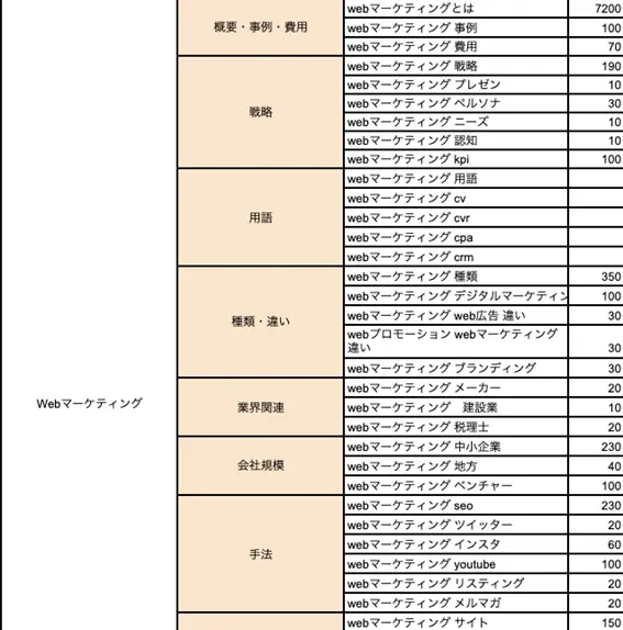 | ミドルキーワード | 1,000~10,000 | 競合サイトも多いが、ビッグキーワードに比べて上位表示の難易度は低い | SEO 施策 |