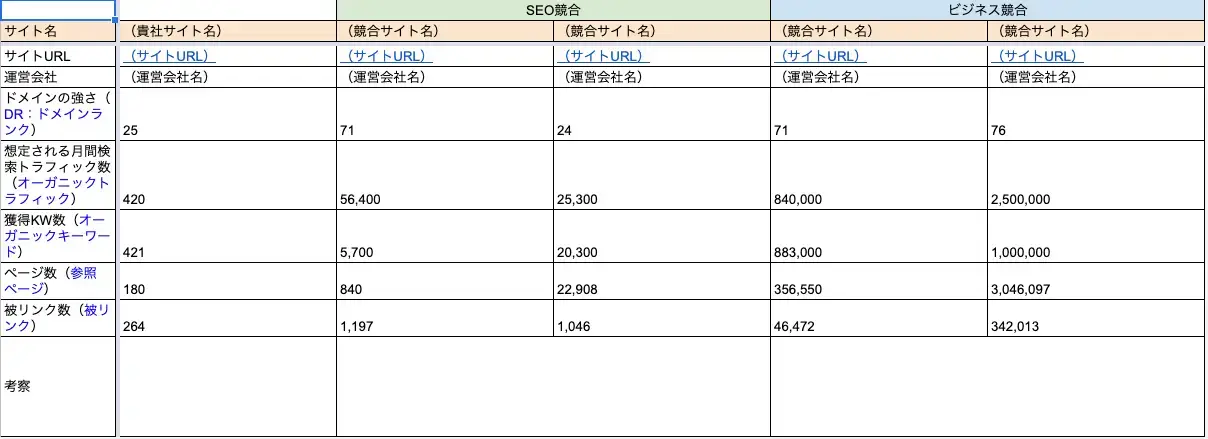 Similarweb(無料)やAhrefs(有料)などのツールを利用し、以下のような表を作成してみてください。