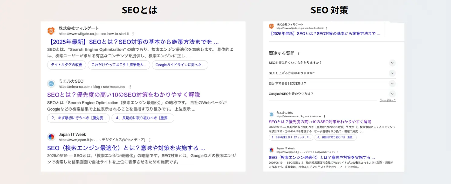 たとえば以下の場合、「SEOとは」「SEO対策」の検索結果が似通っているため、検索意図が同じであると判断できます。この場合、いずれか一つを対策します。