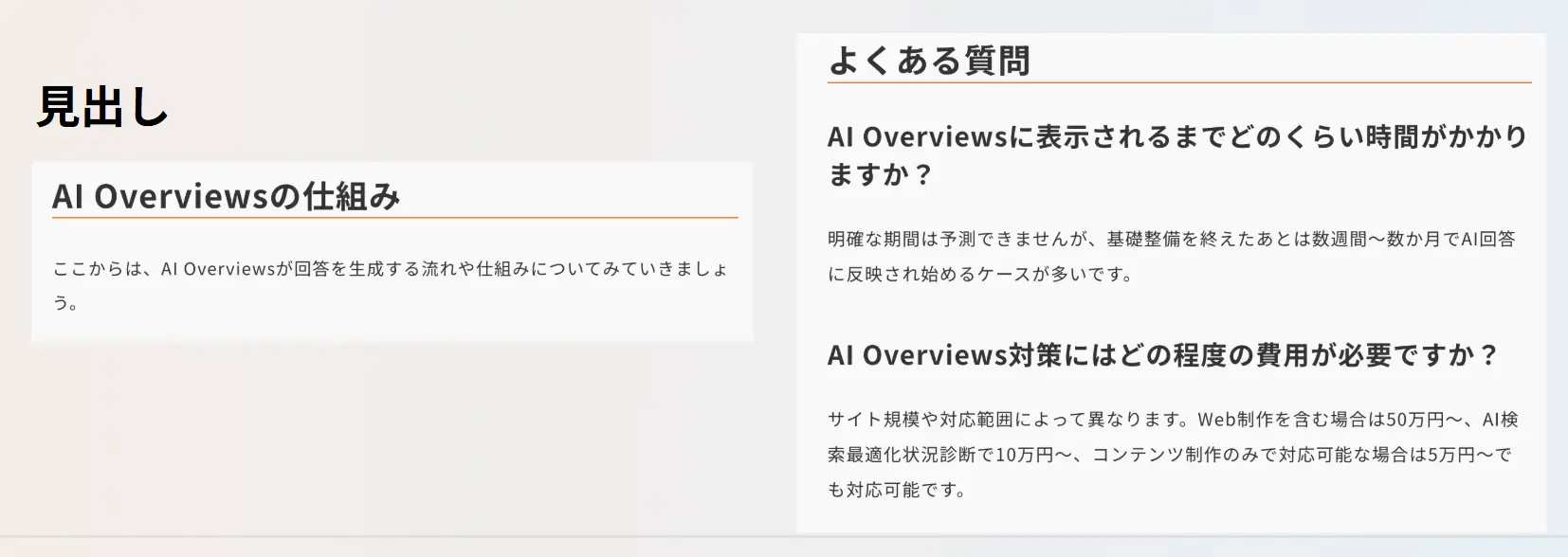 例えば「AI Overviewsに自社サイトを表示させるには?」という記事内で、「AI Overviewsの仕組み」という誰もが知りたい内容は見出しで取り扱います。また、「AI Overviews対策に必要な費用」や「AI Overviewsの表示にかかる時間」など各論の問いについては、よくある質問箇所で扱うことでニーズを満たします。