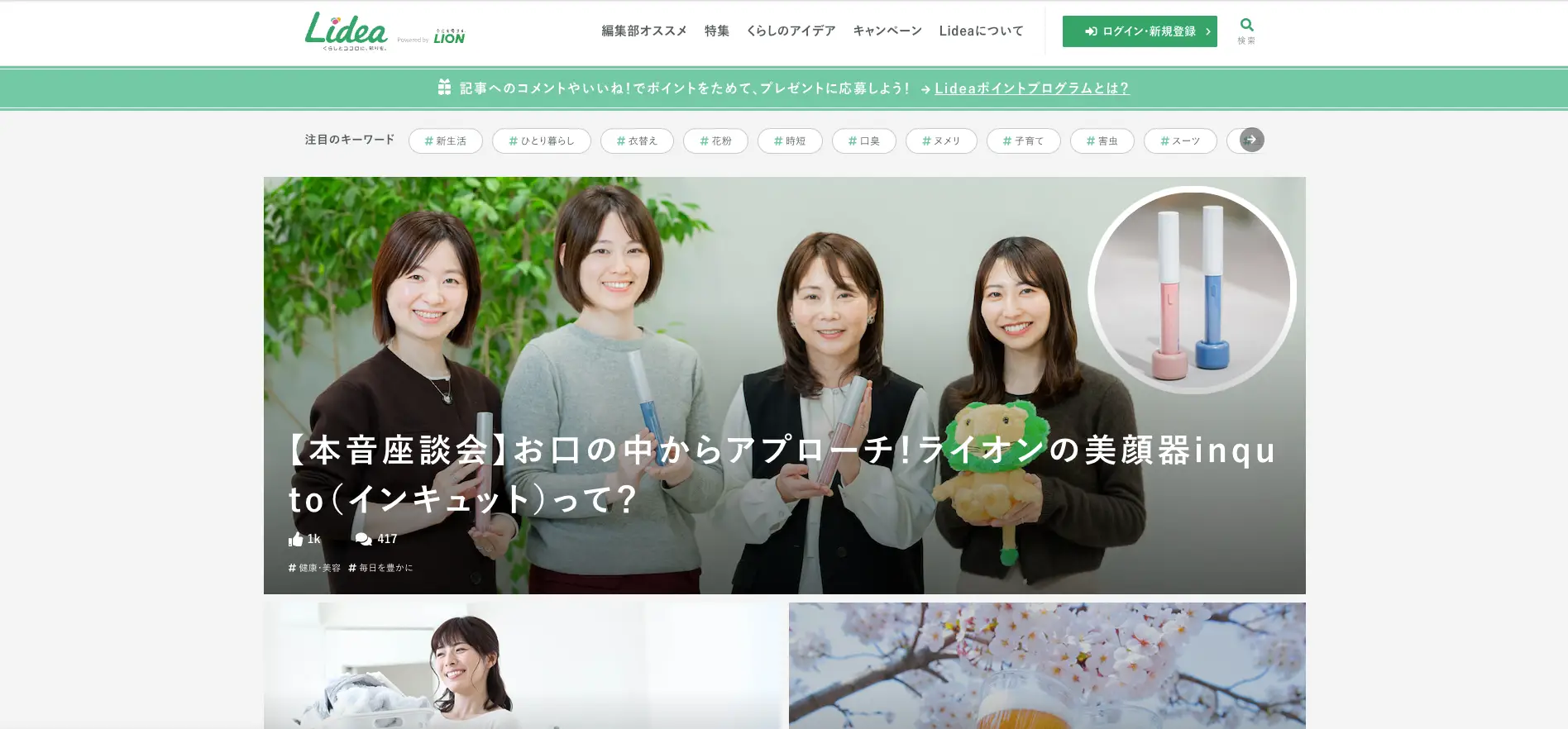 ▲出典:Lideaライオン株式会社が運営するLideaは、「暮らしを豊かにする生活情報」をテーマに、洗濯・掃除・口腔ケア・ヘルスケア・子育てといった日常的なトピックを幅広くカバーするメディアです。
