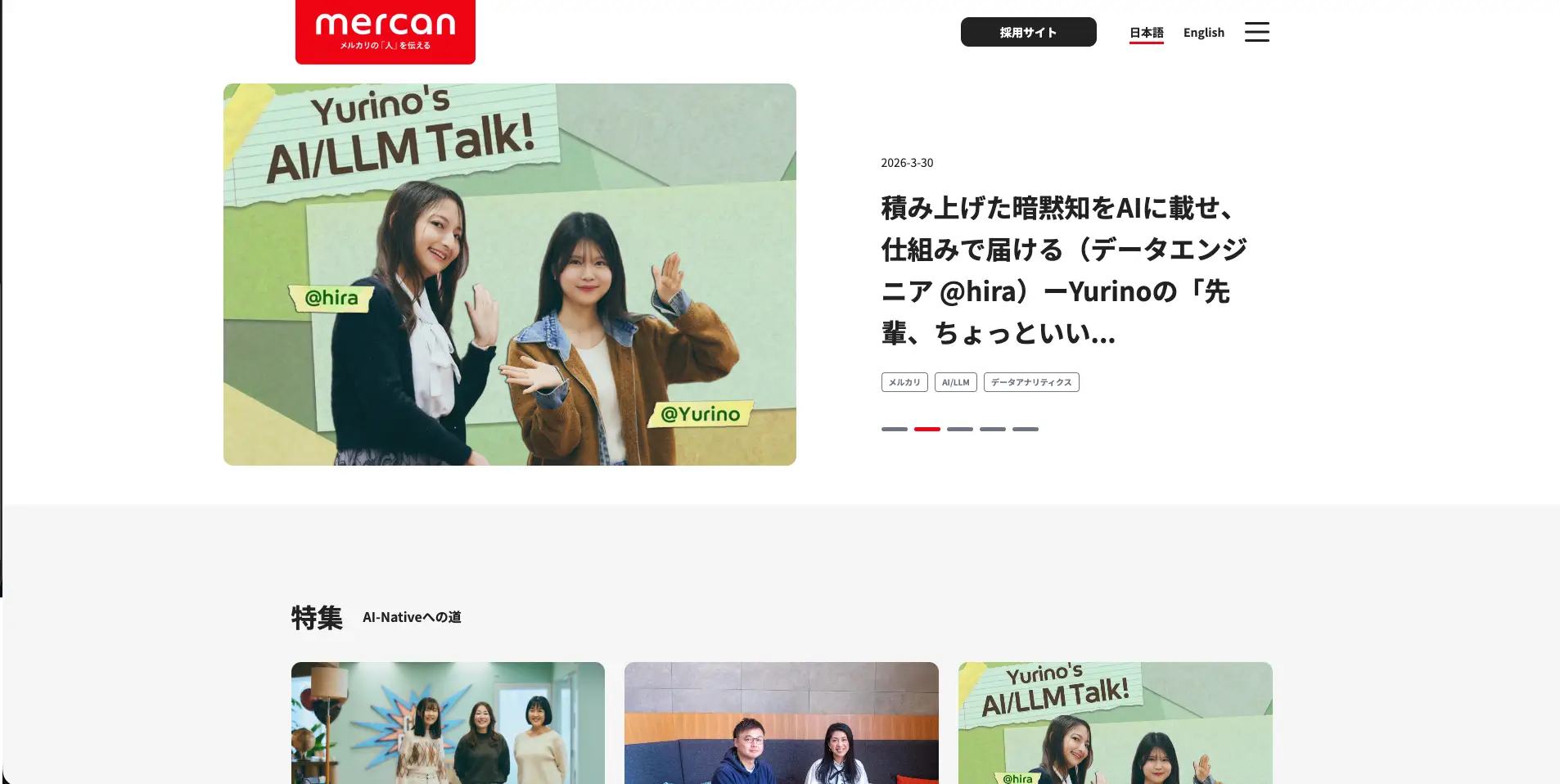 mercanが取り組んでいるのは、「会社の中の人の声」を丁寧に引き出し、読み物として面白いコンテンツにすること。「なぜメルカリに転職したのか」「どんなチームで働いているか」「失敗から学んだこと」——こうした人間的な物語が求職者の共感を呼び、「この会社で働きたい」という感情的な志望動機を醸成します。