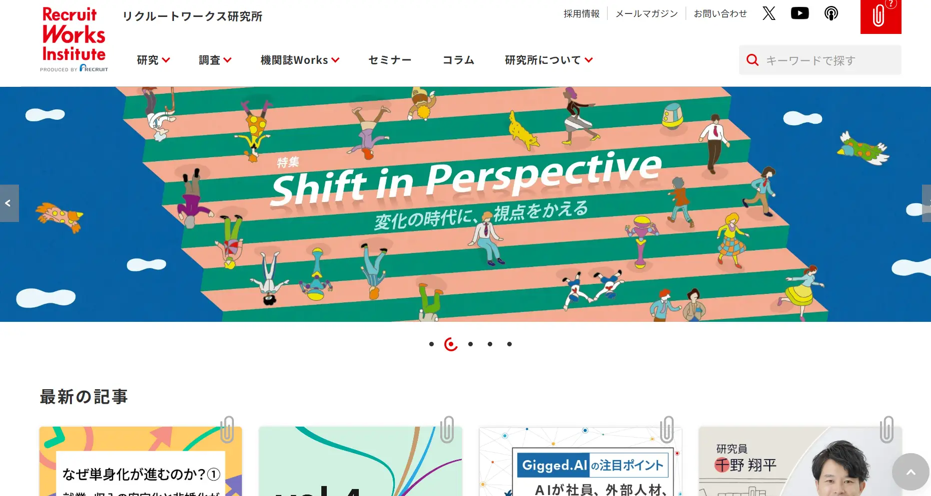「リクルートワークス研究所」は、人と組織に関する研究機関として、学術的な知見と実務の橋渡しを行っています。調査研究に基づいた質の高い情報が特徴です。