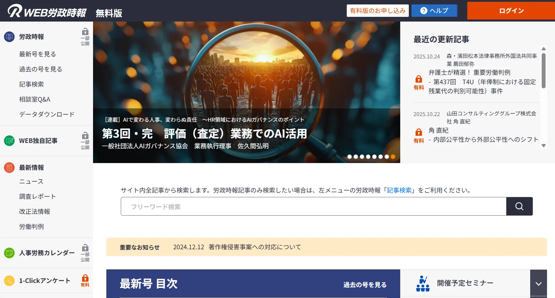 「WEB労政時報」は、労務行政研究所が運営する労務管理の専門メディアです。70年以上の歴史を持つ「労政時報」のWeb版として、企業の人事労務担当者に信頼されています。