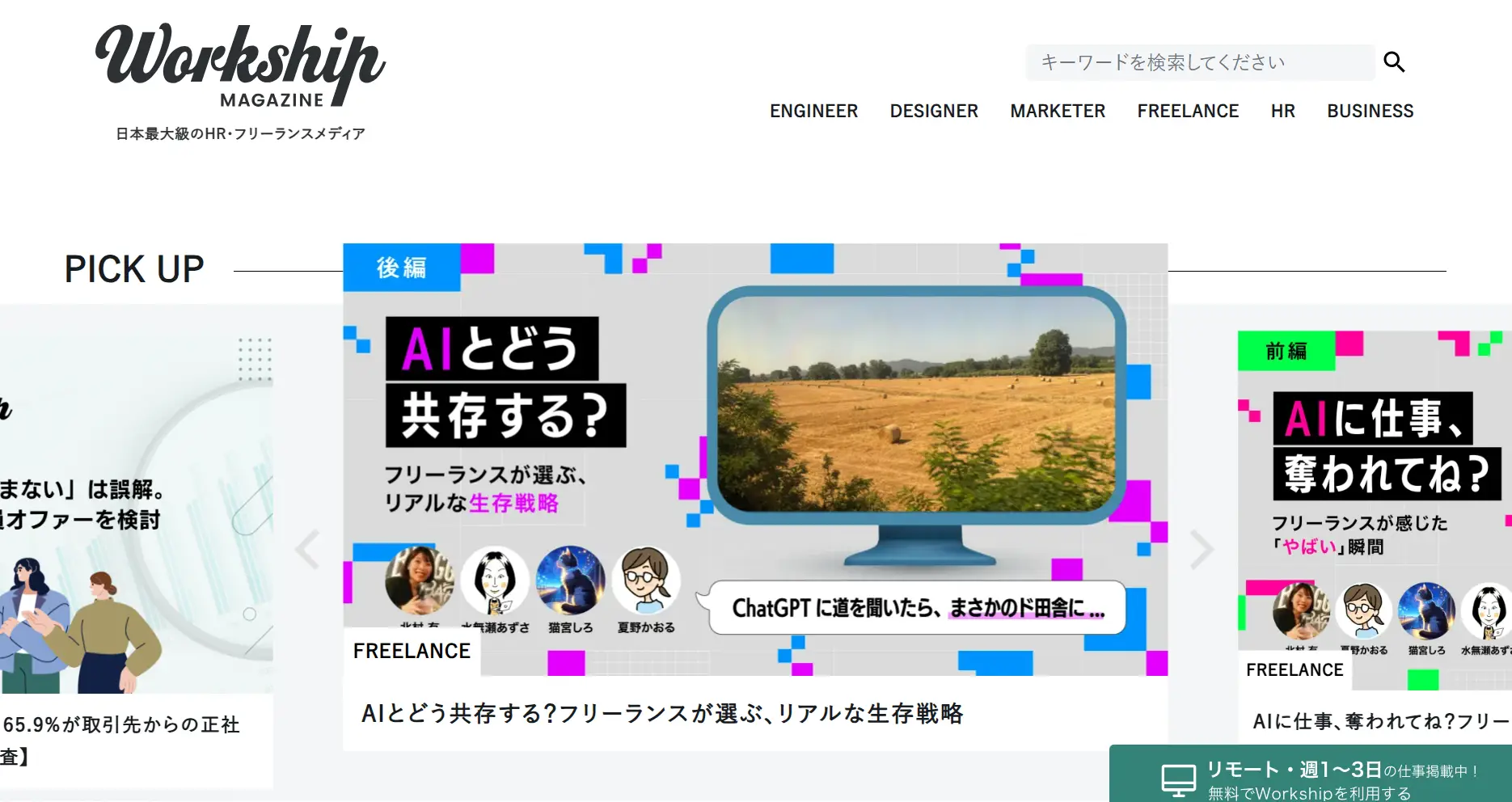 「Workship MAGAZINE」は、フリーランス・副業・業務委託など、柔軟な働き方に関する情報を発信するメディアです。特に、エンジニアやデザイナー、マーケターといったデジタル系専門職の採用に強みを持っています。