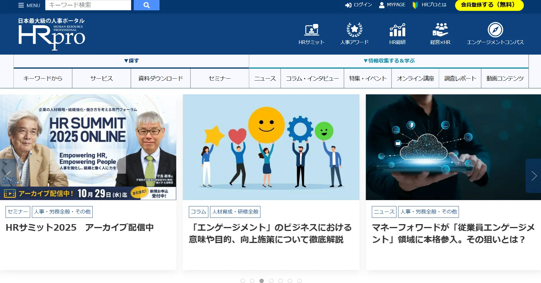 「HRプロ」は、広く人事領域全般を展開する人事ポータルサイトです。HR総研が実施する調査レポートは業界内でも高い評価を受けており、定量的なデータに基づいた分析が特徴です。最新の人事トレンドを数値で把握したい場合に非常に有用でしょう。