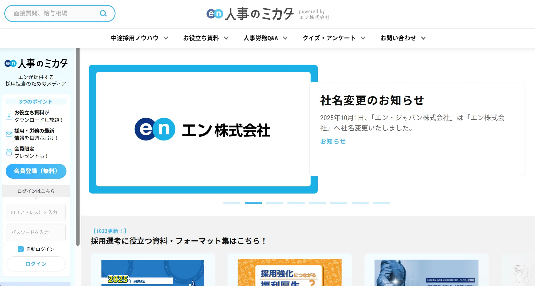 「人事のミカタ」は、エン株式会社が運営する人事・採用・労務に関する総合情報サイトです。採用から労務まで幅広くカバーしつつ、特に中小企業向けの実践的な情報が充実しています。