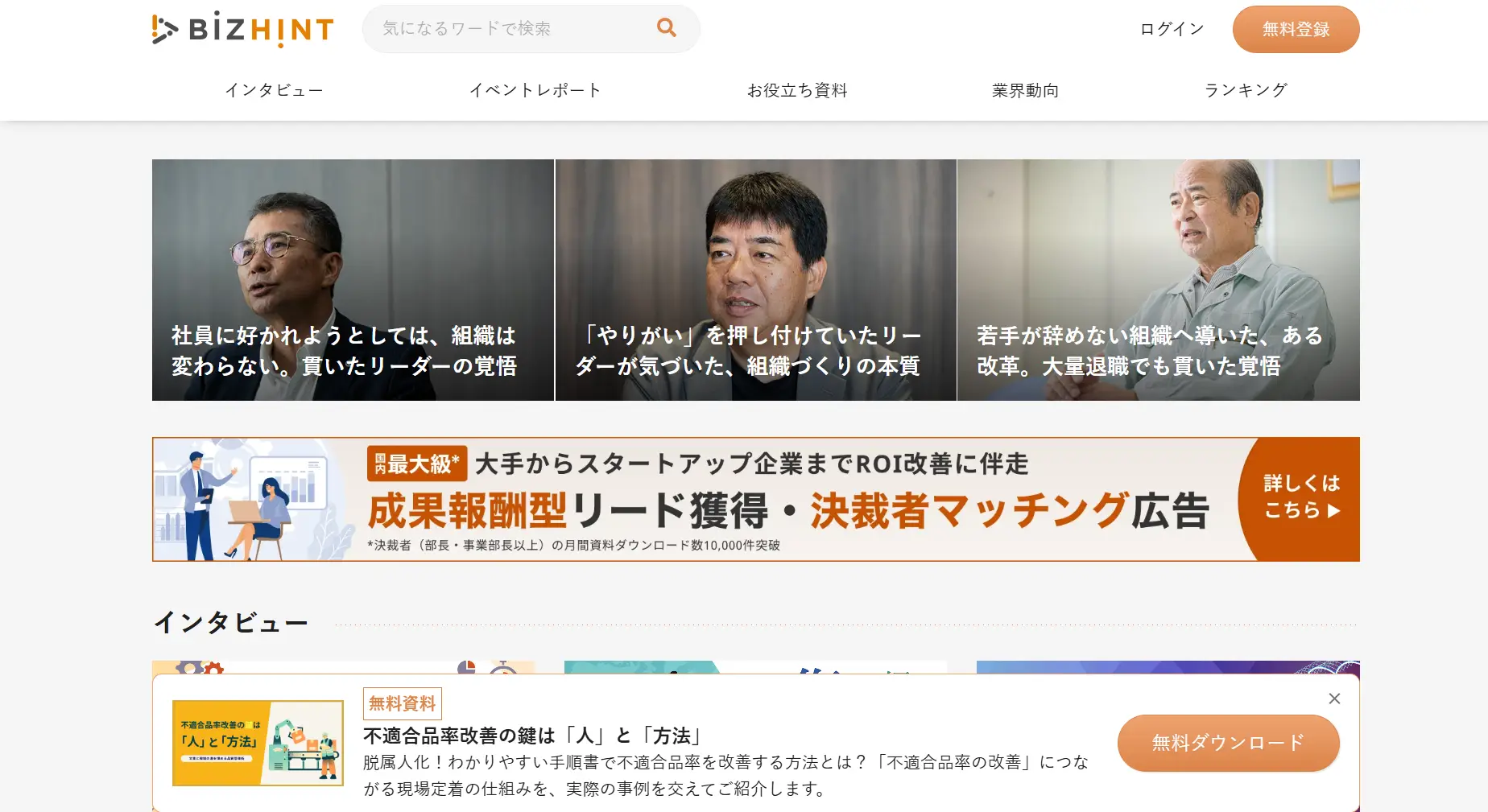 「BizHint」は、ビジネスの生産性向上とクラウド活用を支援する総合メディアです。経営者・決裁者向けですが、組織開発や人材マネジメントに関する記事も充実しており、経営視点から人事を学べます。