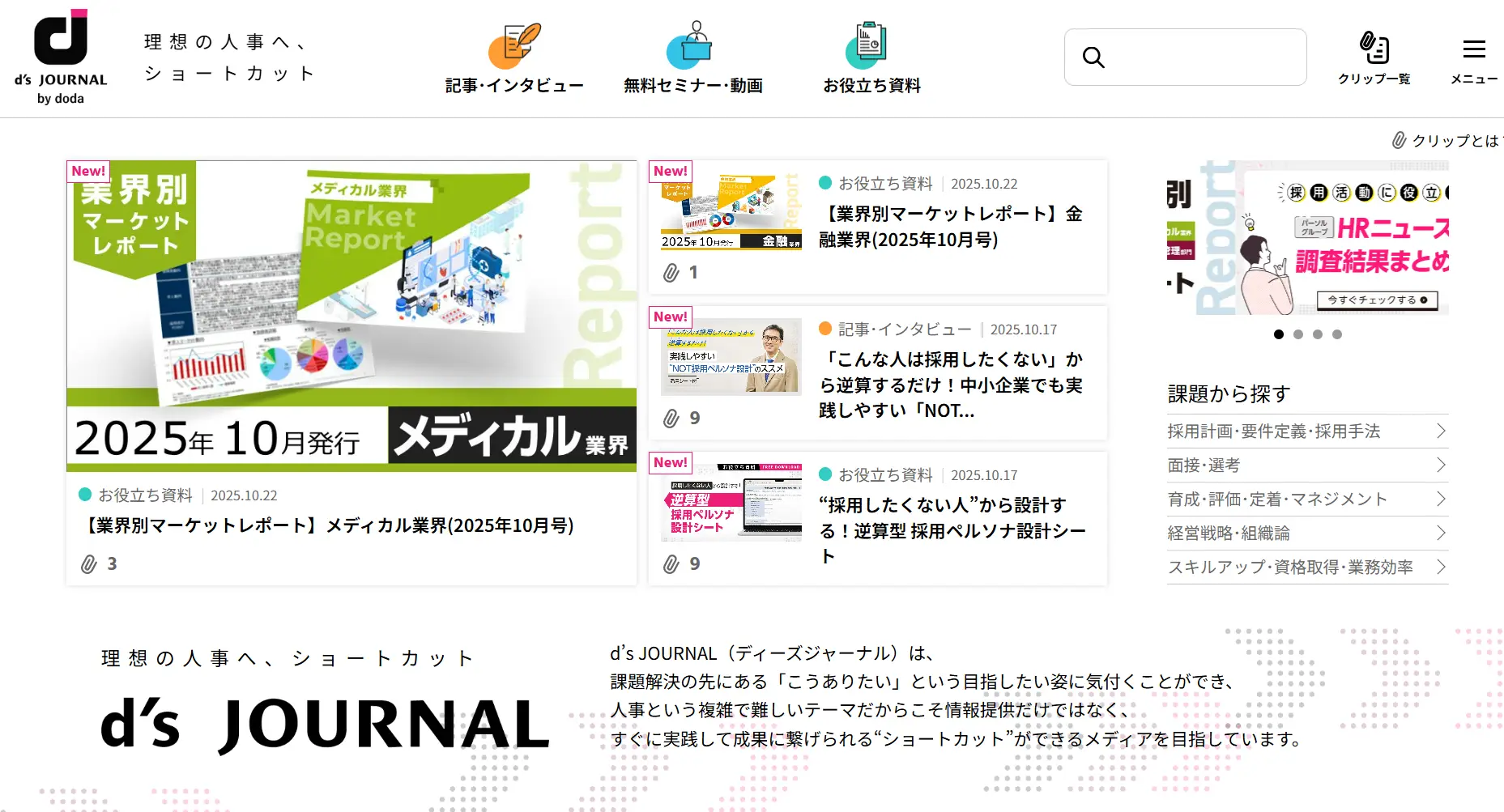 「d's JOURNAL」は、dodaを運営するパーソルキャリアが提供する採用メディアです。「採用で組織をデザインする」をコンセプトに、戦略的な採用活動を支援する情報を発信しています。