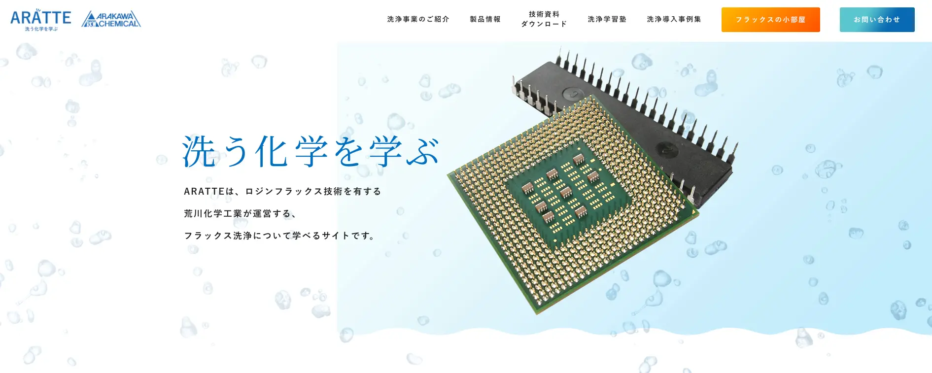 化学メーカーの荒川化学工業株式会社が運営する「ARATTE」は、洗浄技術に特化したオウンドメディアです。洗浄剤の選び方や洗浄方法の基礎知識など、実務で役立つ情報を網羅的に提供しています。