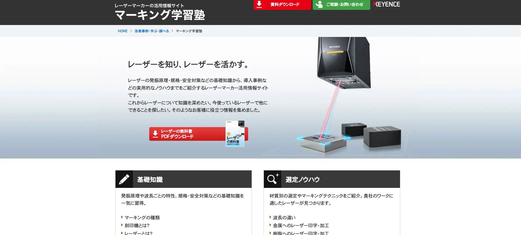 FA機器メーカーのキーエンスは、複数のオウンドメディアを展開しています。その一つである「マーキング学習塾」では、レーザーマーカーに関する幅広い知識を発信し、導入検討段階のユーザーへの教育コンテンツとして機能しています。