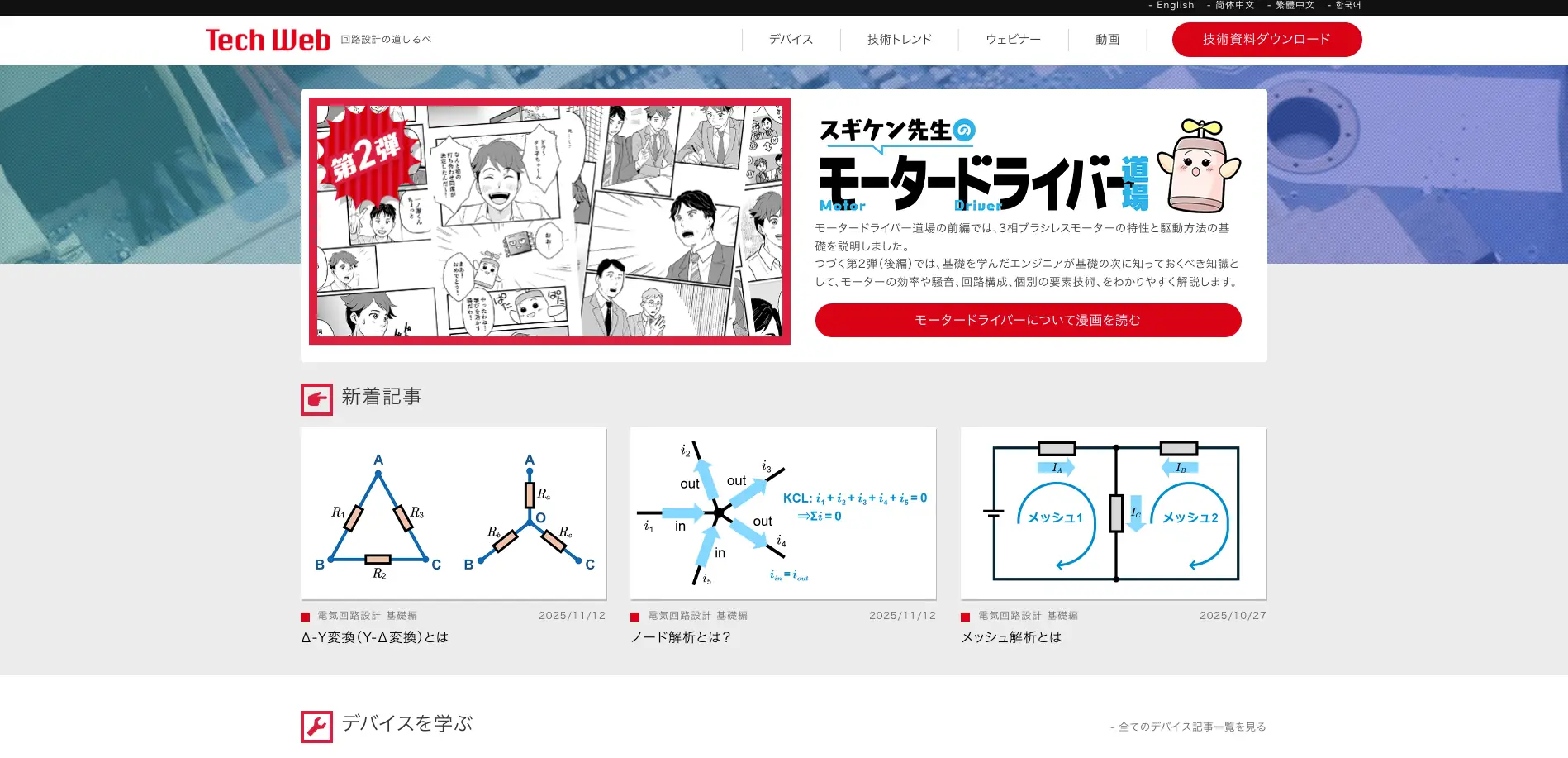 電子部品メーカーのローム株式会社が運営する「ROHM TechWeb」は、電源設計やEMC対策などの技術情報を体系的に発信するオウンドメディアです。初心者から上級者まで幅広いレベルに対応したコンテンツ設計が特徴で、技術者の学習ニーズに応えています。