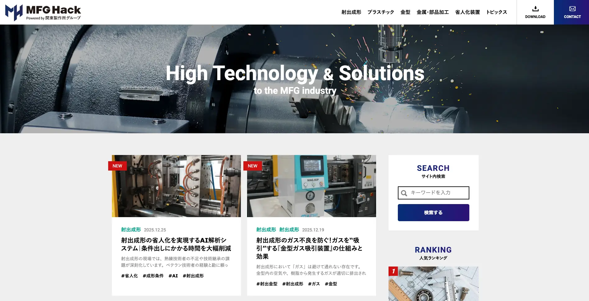 金型メーカーの関東製作所が運営する「MFG Hack」は、製造業のDXや生産性向上に関する情報を発信するオウンドメディアです。金型という自社の専門領域にとどまらず、製造業全体に価値を提供するコンテンツ戦略が特徴です。