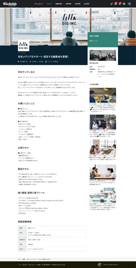 GIGが運営するフリーランス・副業人材専門の求人・案件検索プラットフォーム「Workship」での掲載例