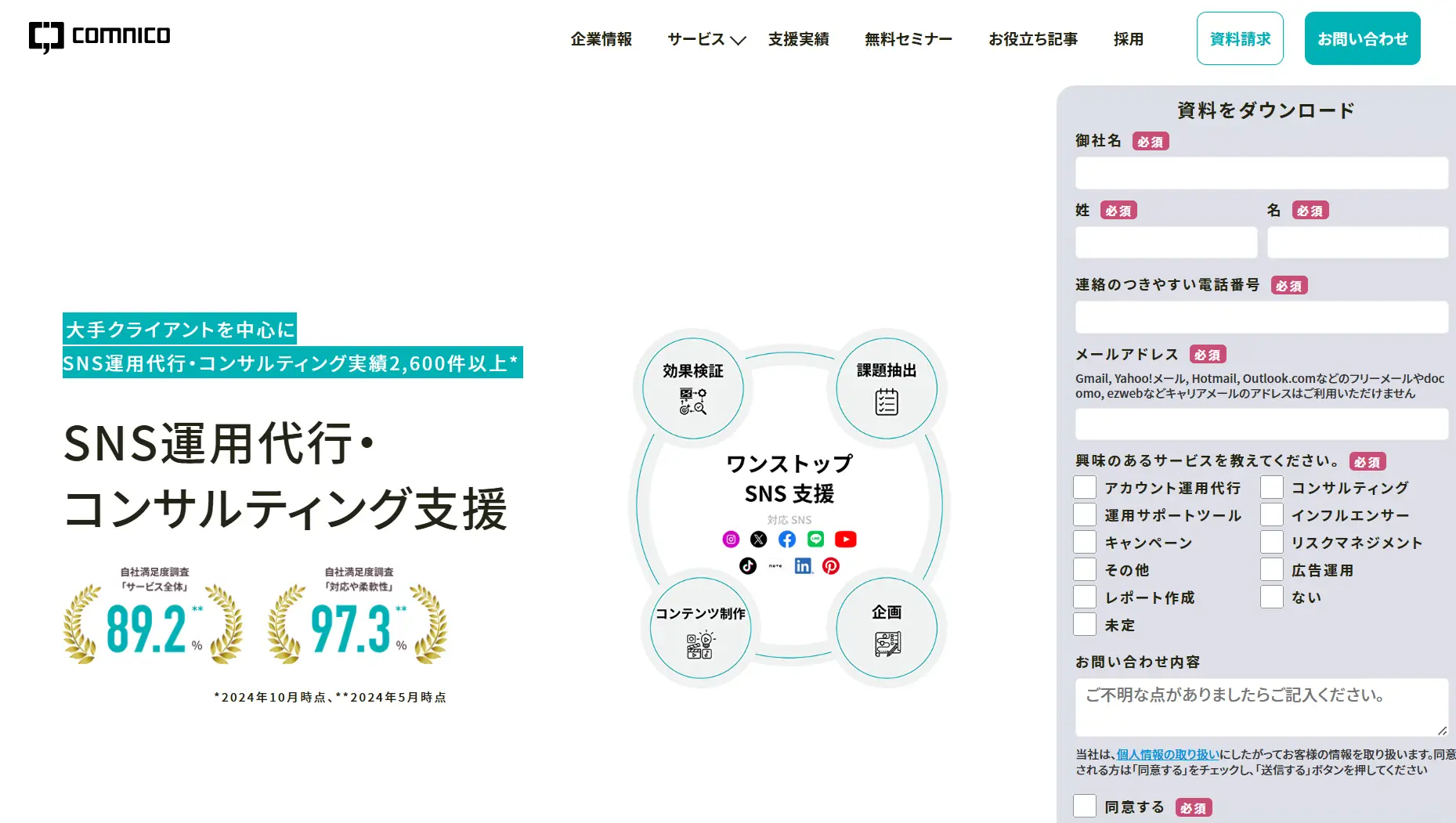 株式会社コムニコは、SNS運用代行の老舗として豊富な実績とノウハウを持つ企業です。大手企業を中心に2,600件以上の運用実績があり、業界トップクラスの信頼性を誇ります。X、Instagram、Facebook、LINE、TikTokなど、主要SNSすべてに対応可能です。