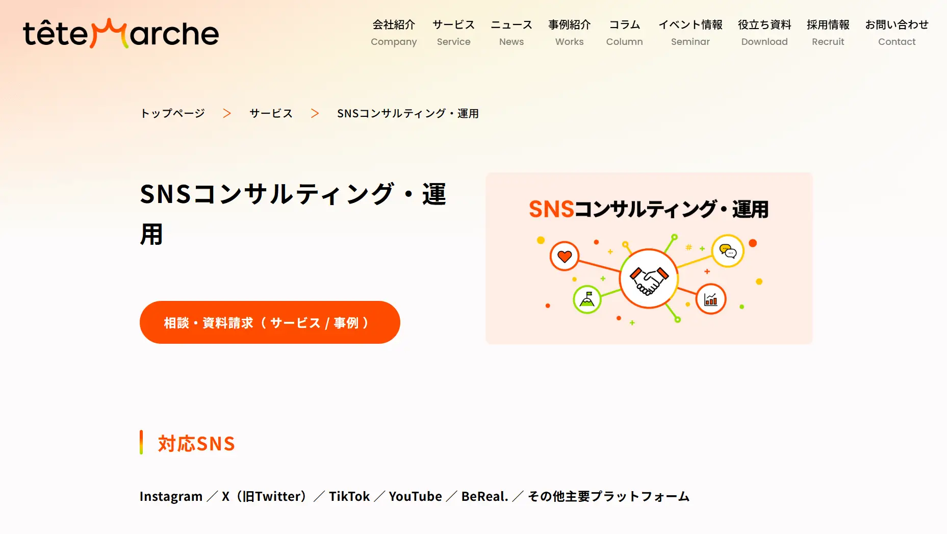 X、Instagram、Facebook、Pinterest、Threads、BeReal、LINEなど多様なSNSに対応し、各領域のスペシャリストが徹底伴走します。
