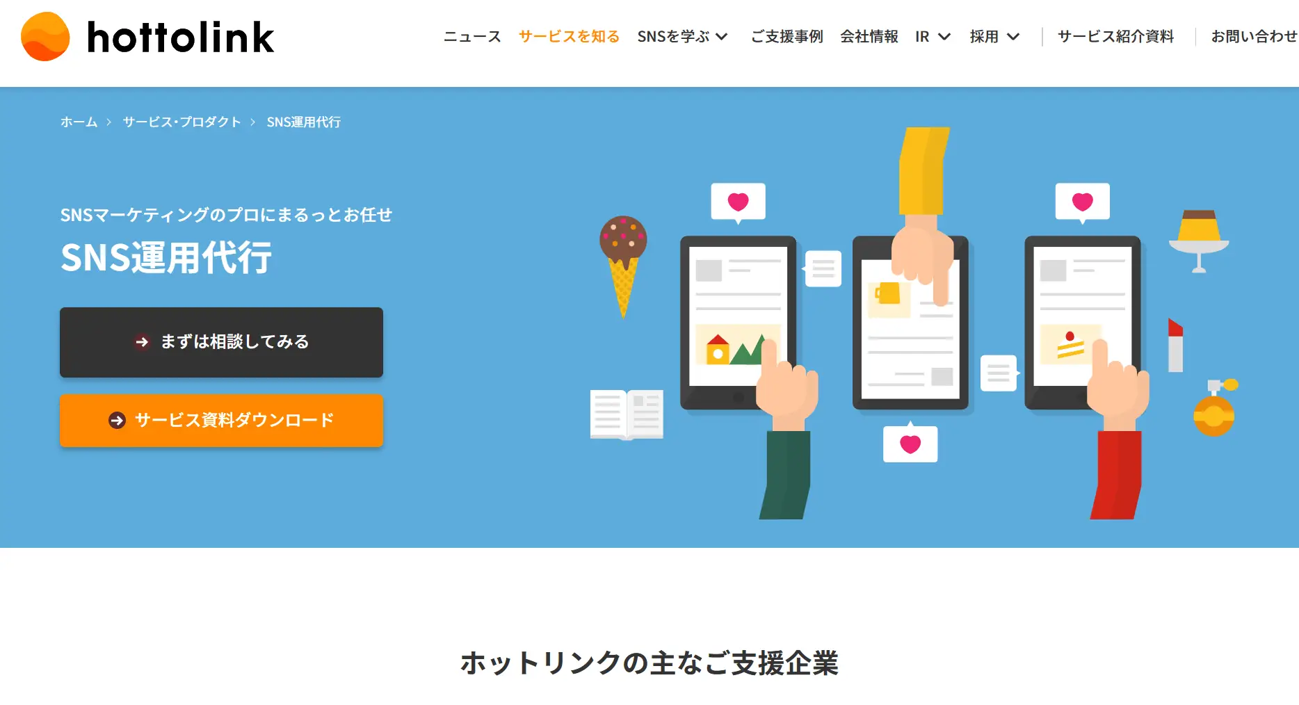 運用代行支援とコンサルティング支援の2つのサービスを提供しており、企業のニーズに応じて選択できます。戦略策定から投稿作成、効果測定、改善提案まで一気通貫でサポートし、各分野のプロが複数名でチームを組む盤石な体制が特徴です。
