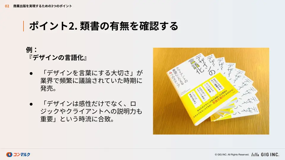 商業出版の企画を通すために必要な3つのポイントを実例とともに解説します。1. 類書との差別化方法(テーマの掛け合わせ、切り口の工夫)、2. 社会トレンドとの適合性の見極め方、3. 著者の知名度や信頼性を高める具体的な戦略について、出版社の視点を交えてお伝えします。知名度・フォロワー数はあった方が有利ですが、絶対条件ではありません。フォロワー数100人以下でも出版している例も踏まえてご紹介します。