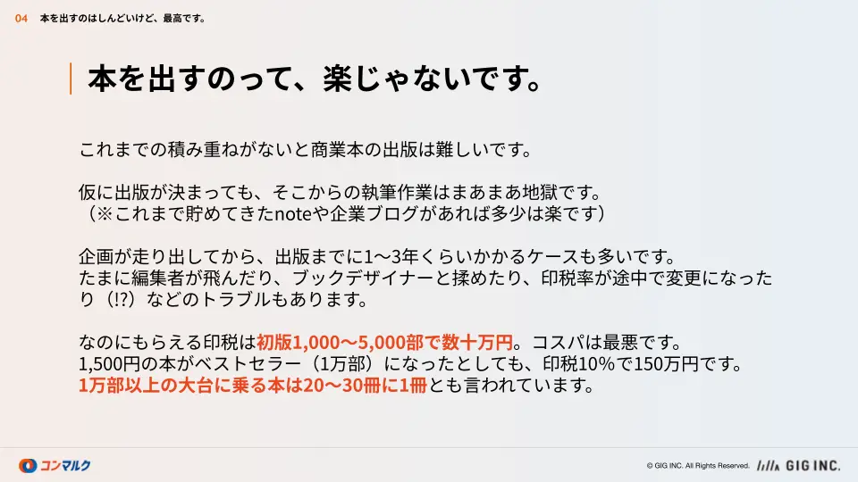 本動画では、あまり語られることのない出版までの「しんどい」現実——執筆の苦労や予期せぬトラブル、収益性、タイムスケジュールについて正直にお伝えします。 一方で、なぜ多くのビジネスパーソンや企業が本を出すことに挑戦するのか、ブランド構築や事業展開におけるメリットについても解説します。